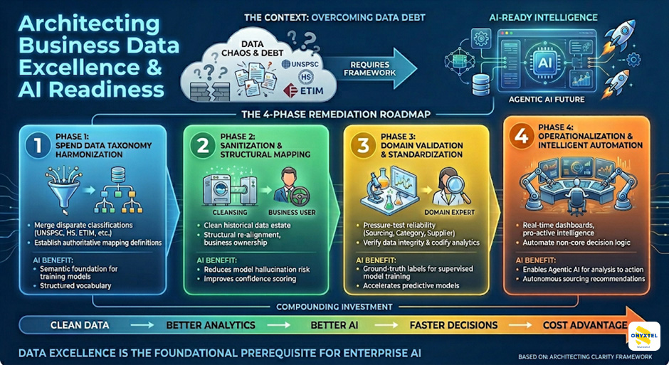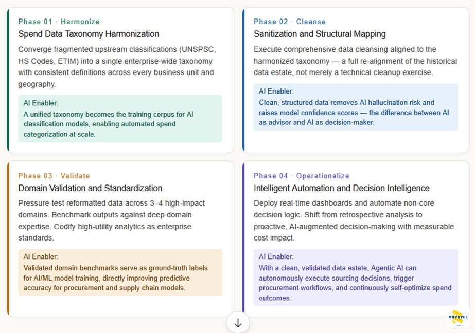 | 03 — Validate | Stress-test cleansed data across 3–4 high-impact domains: sourcing, category management, supplier performance, and cost-to-serve. Codify outputs as enterprise analytics standards. | Validated benchmarks become ground-truth training labels, directly accelerating the accuracy of predictive procurement and supply chain models. |